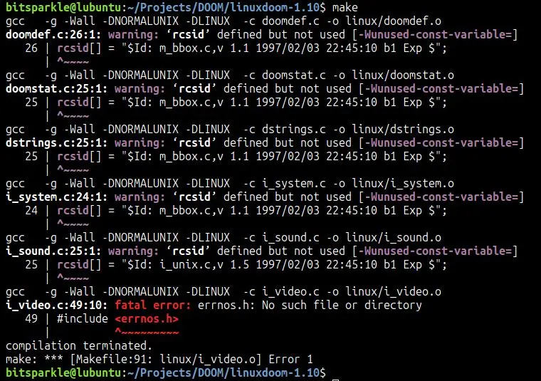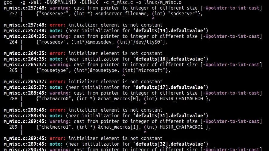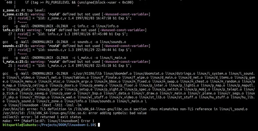 Excluding the many warnings that were completely ignorable, all the code compiled correctly (at least apparently), there is only a problem with the linker. It’s a problem with the file i_sound.c, even if nothing else is told to us.